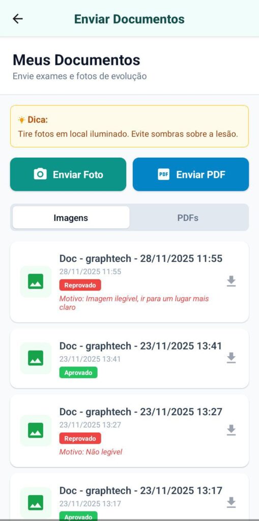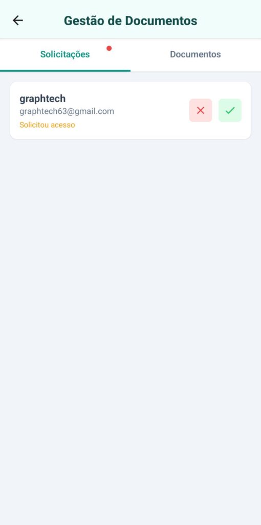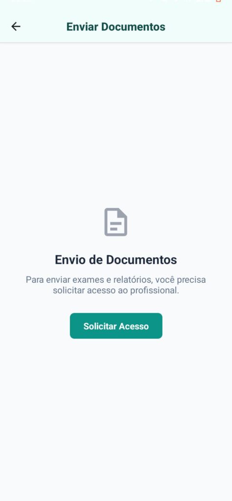 A gestão de documentos é uma função essencial para qualquer profissional da saúde que busca eficiência e organização no atendimento. Pensando nisso, o aplicativo traz essa funcionalidade implementada com total segurança, permitindo que os pacientes enviem fotos ou documentos diretamente ao profissional mediante uma solicitação de acesso. Esse processo garante praticidade e agilidade, já que o profissional passa a ter em mãos os arquivos necessários de forma rápida e protegida, sem burocracia. Com isso, o fluxo de trabalho se torna mais dinâmico e o atendimento ganha em qualidade, fortalecendo a confiança entre paciente e profissional.
