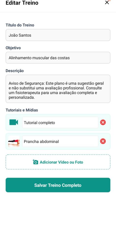 Os treinamentos são disponibilizados diretamente no aplicativo, permitindo que os pacientes tenham acesso de forma simples e prática. Essa funcionalidade torna o acompanhamento muito mais eficiente, já que, por meio de descrições detalhadas, imagens e vídeos, o paciente consegue realizar os exercícios de maneira completa, mesmo em casa, quando necessário. Dessa forma, o profissional garante que o tratamento não se limite apenas às sessões presenciais, oferecendo continuidade, autonomia e segurança para que o paciente siga corretamente suas orientações.