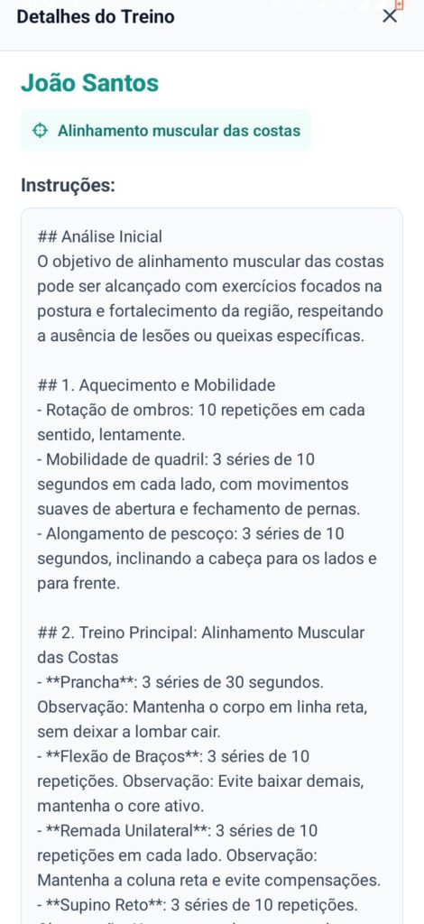 As ferramentas de inteligência artificial presentes no aplicativo permitem analisar a postura do paciente de forma prática, realizando uma triagem precisa e oferecendo treinos personalizados que auxiliam na correção de condições como hipercifose, má postura entre outros. O profissional pode salvar e editar os treinos gerados, acrescentar suas próprias observações e compartilhar o resultado em PDF com o paciente, o que aumenta a credibilidade e o profissionalismo no atendimento. Além disso, o aplicativo conta com um gerador de treinos personalizados que utiliza o histórico médico, as queixas e os objetivos do paciente para criar planos de exercícios seguros e eficientes. Dessa forma, o recurso contribui tanto para o progresso dos pacientes quanto para a otimização do trabalho dos profissionais da saúde.